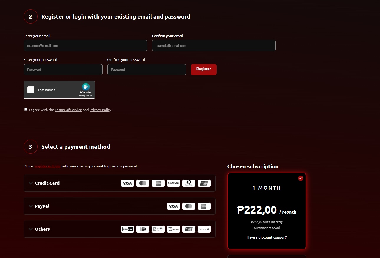 Step 3: Register an account, log in and choose your payment method.